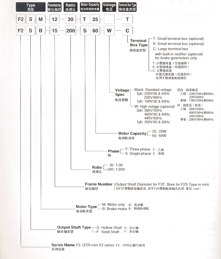 日精GTR小型直交空心軸減速機F2S系列型號表示
