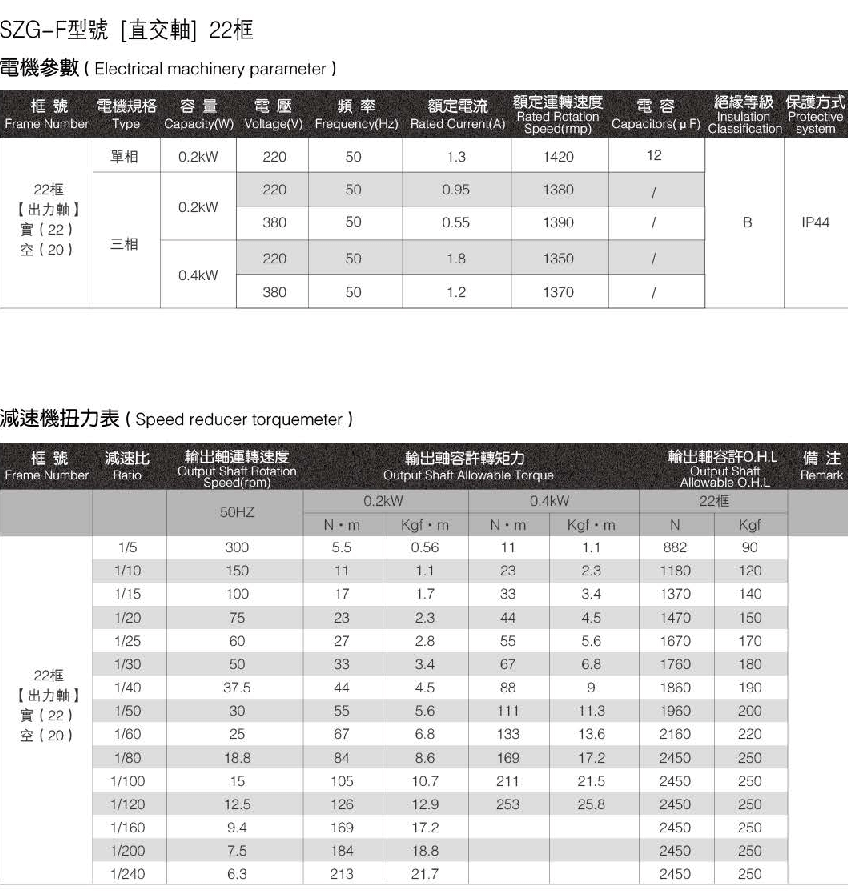 SZG-F型-22框直交軸減速電機參數(shù)及減速機扭力表