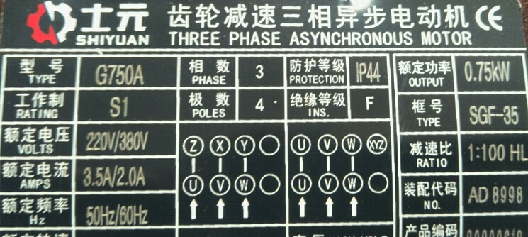 士元齒輪減速三相異步電動(dòng)機(jī) SGF35-HL-750-100-S直角中空減速機(jī)銘牌蘊(yùn)含很多詳細(xì)信息,表示該直角減速機(jī)孔為35mm,功率750W,數(shù)比1:100,三相交流直角中空減速機(jī)。蘇州邁傳專注直角減速機(jī)生產(chǎn)供應(yīng),主營士元直角減速機(jī)、直角中空減速機(jī)、直角中實(shí)減速機(jī)以及雙出軸減速機(jī)和雙法蘭直角中空減速機(jī)等等,選型報(bào)價(jià)請致電18136118447盛。