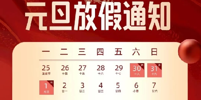 2023年12月30日(星期六)至1月1日(星期一)放假3天;